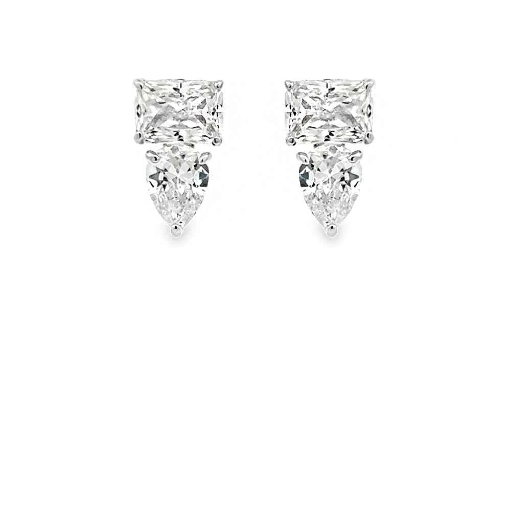 Сребърни обеци с два блестящи циркония – един с правоъгълна шлифовка и един с форма на капка, събрани в елегантен минималистичен дизайн.
