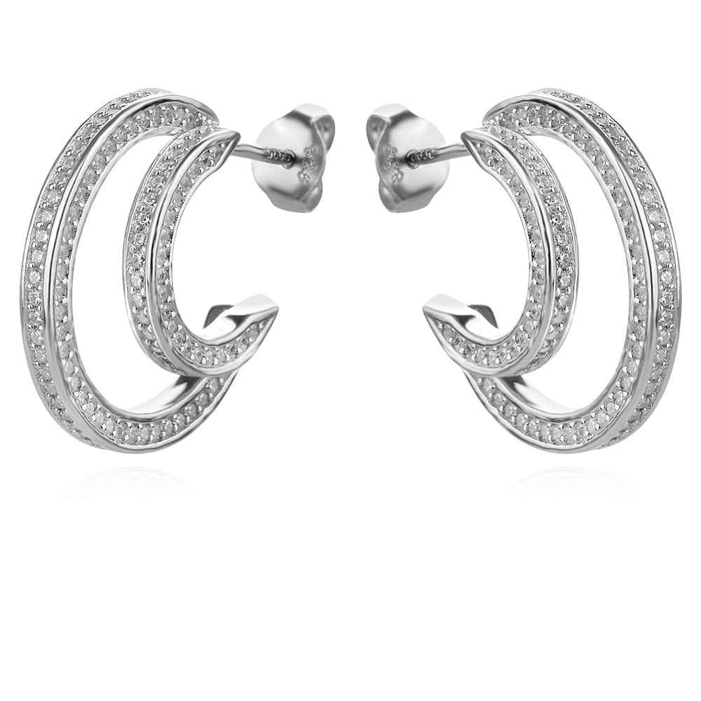 Топ тренд! Стилни модерни сребърни обеци с цирконии, които перфектно комбинират две халки с различни диаметри в една обеца. Закопчаването е на щифт.