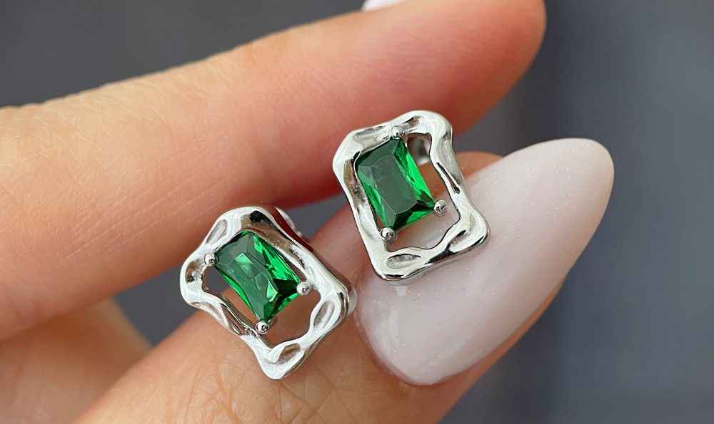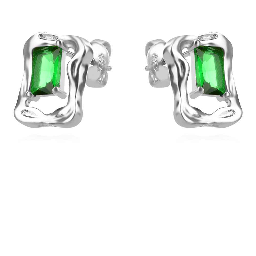 Подчертайте визията с тези малки модерниситчни сребърни обеци на щифт с изумрудено зелен цирконий. Обеците са с родиево покритие, което предпазва среброто от оксидация.