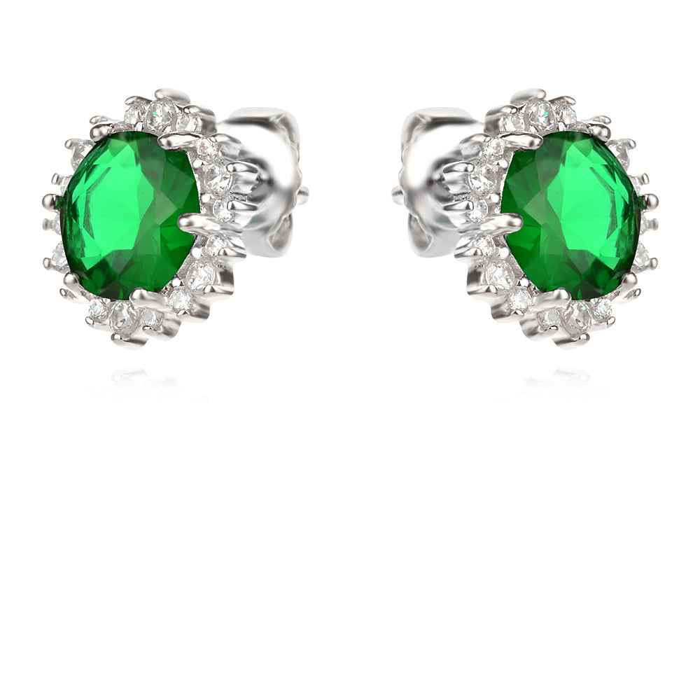 Малки деликатни сребърни обеци с изумрудено зелен кръгъл цирконий в хало от бели цирконий. Обеците са закопават на щифт и прилягат плътно към ухото. Бижуто е с родиево покритие, което предпазва среброто от оксидация.