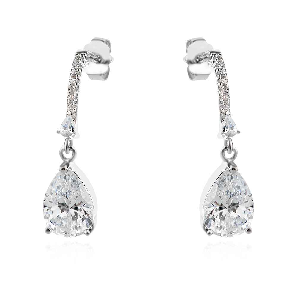 Стилни леко висящи сребърни обеци за повод с цирконии ice cut за забележителен блясък. Прецизно родиево покритие предпазва среброто от оксидация. Закопчаването е на щифт.