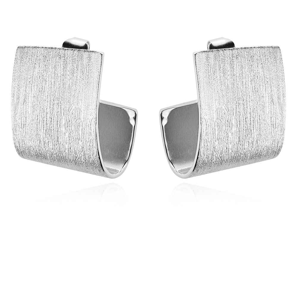 Ефектни сребърни обеци с модерниситчен дизайн и красив матов финиш. Закопчаването е на щифт. Обеците са с родиево покритие, което предпазва среброто от оксидация.