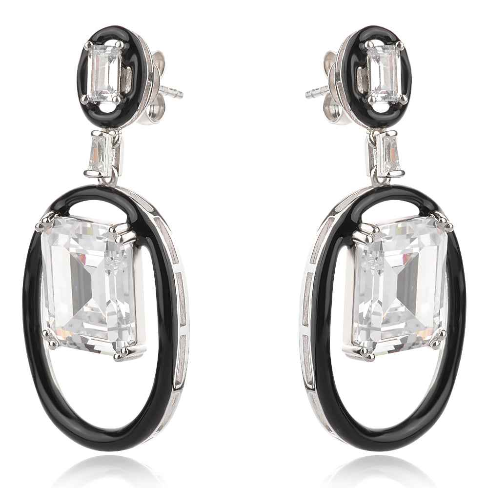 Сребърни обеци от колеция Black & White- родирано сребро, обгърнало перфектно фасетирани циркони, контрастирани с модерен черен емайл. Една ярка геометрична абстракция, която ще премине теста на времето и ще се превърне във вечната екстравагантна класика в бижутерската ви. Всъщност, рядко ще се застоява там ?