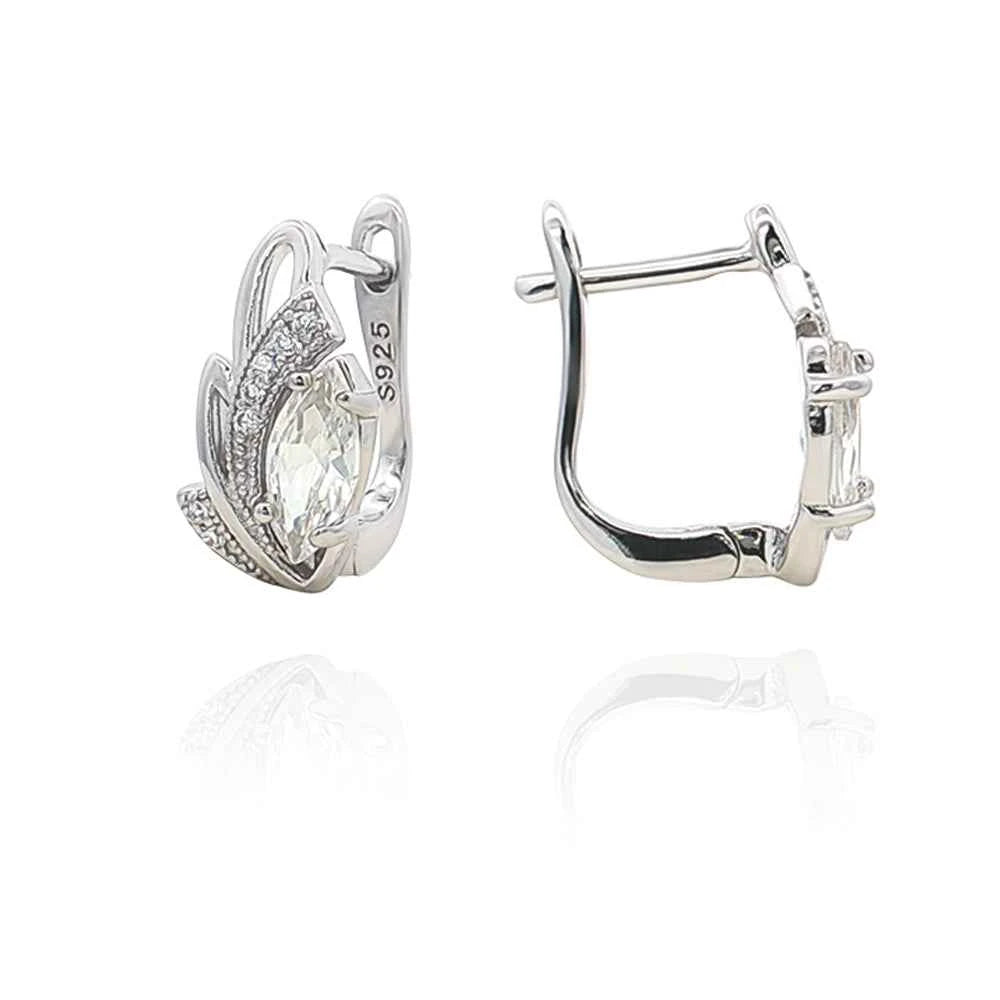 Сребърни обеци с цирконий в листовидна форма. Леките извивки и деликатния блясък на камъните подчертават женствеността, а родиевото покритие предпазва обеците от потъмняване. Перфектен избор за всяка дама, която иска елегантен акцент с доза блясък. Обеците са с удобно английско закопчаване.