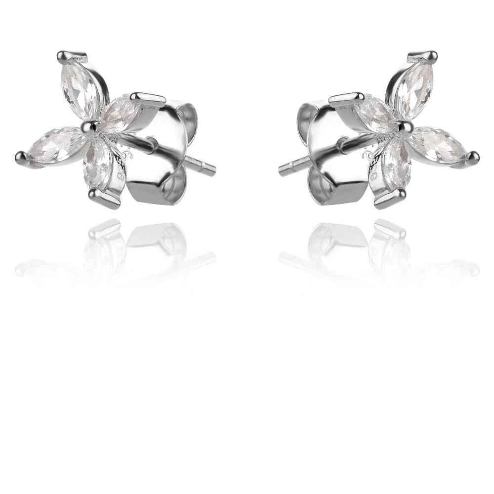Нежни сребърни обеци с форма на малко цветче от цирконии. Обеците са с прецизна родиево покритие. Закопчаването е на щифт с винт.