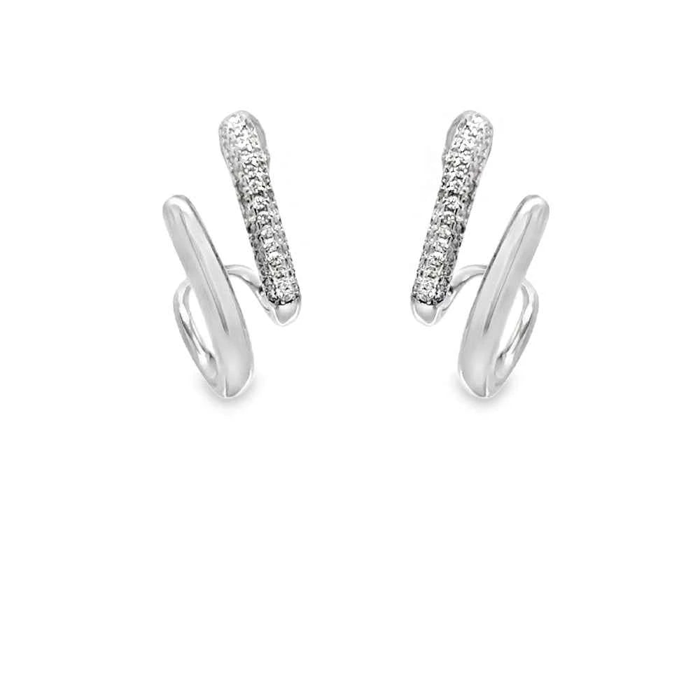 Двойни сребърни обеци със стилни линии и акцент от блестящи цирконии. Балансът между изчистена форма и искрящи камъни ги прави универсален избор – от ежедневието до вечерните излизания. Закопчаването е на щифт.