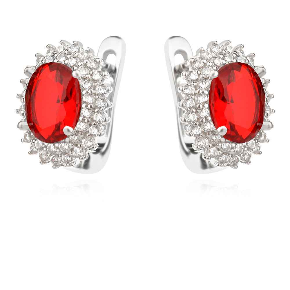 Добавете цвят и елегантност към визията с тези нежни сребърни изкушения с наситено червени цирконии елипси в хало от бели цирконии. Обеците са с удобно английско закопчаване и родиево покритие, което предпазва среброто от оксидация и запазва блясъка на бижуто.