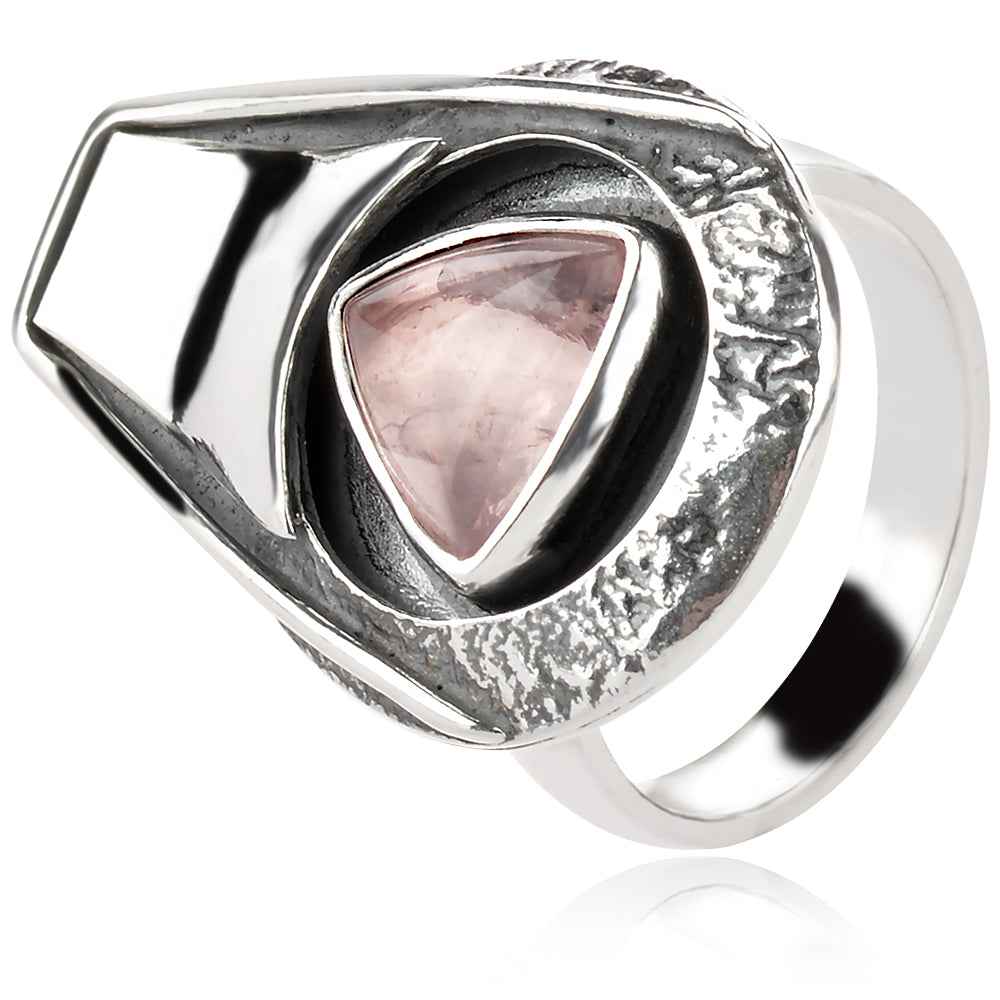 Ръчно изработен сребърен пръстен с естествен розов кварц кабошон, оксидация и полировка.