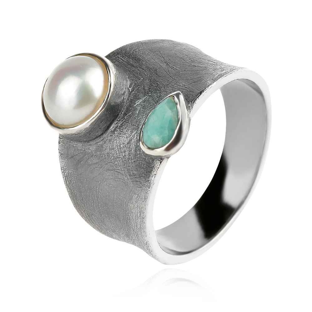 Италиански сребърен пръстен тип халка с модерен семпъл дизайн, плътна удобна халка с оксидация, перла и капка амазонит.