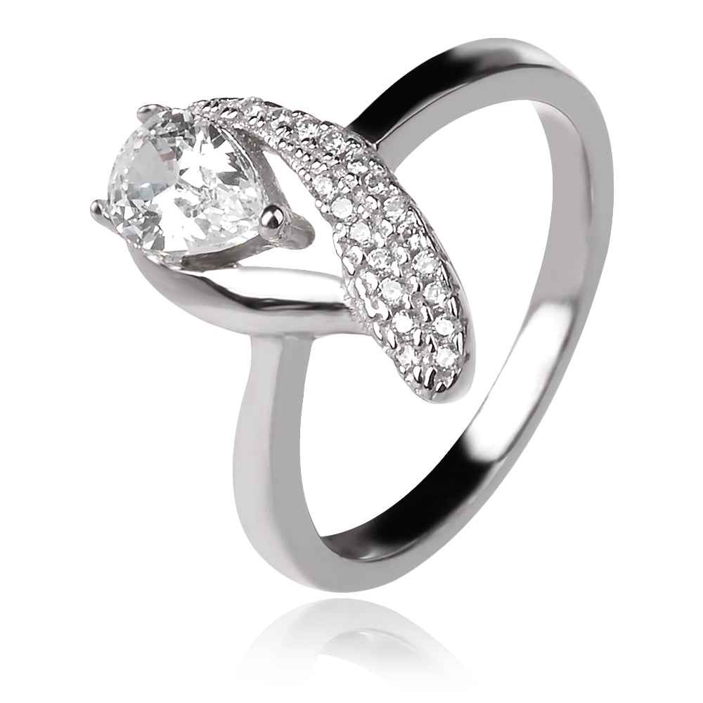 Сребърен пръстен с циркон във формата на капка и нежен обков обсипан с малки циркони. Пръстенът е с родиево покритие, което предпазва среброто от оксидация и гарантира блясъка на бижуто.