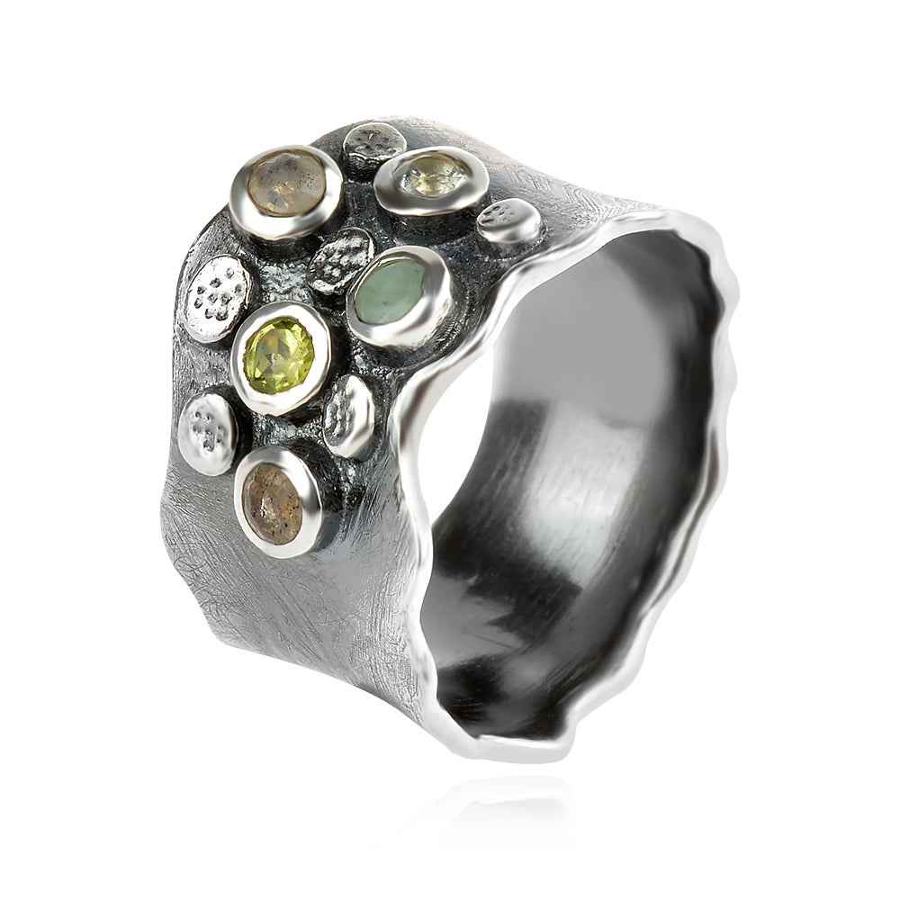 Италиански сребърен пръстен с модерен абстрактен дизайн, широка удобна халка с оксидация и микс от минерали: цитрин, лунен камък, халцедон...