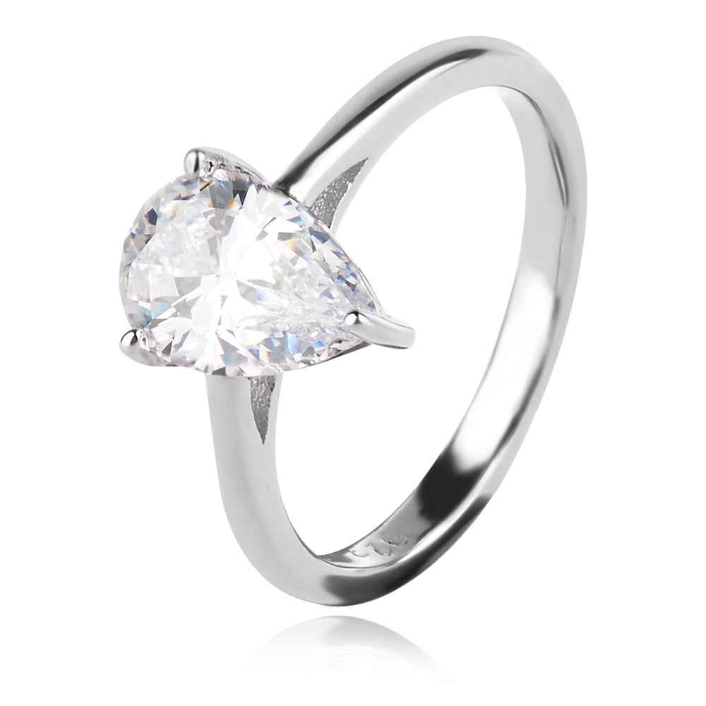 Сребърен пръстен с бял циркон във формата на капка. Перфектния фасет на камъка създава впечатляващ блясък, а родиевото покритие предпазва среброто от потъмняване и гарантира блясъка на бижуто.