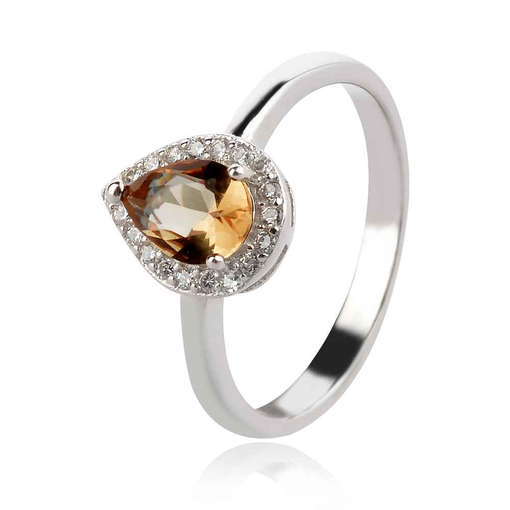 Сребърен пръстен с фасетиран лабораторен султанит под формата на капка, инкрустиран в сребърна каса в рамка от бели циркони.