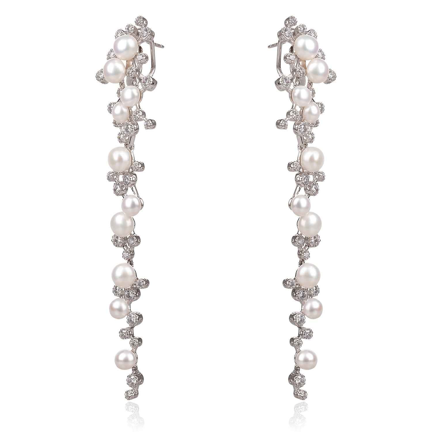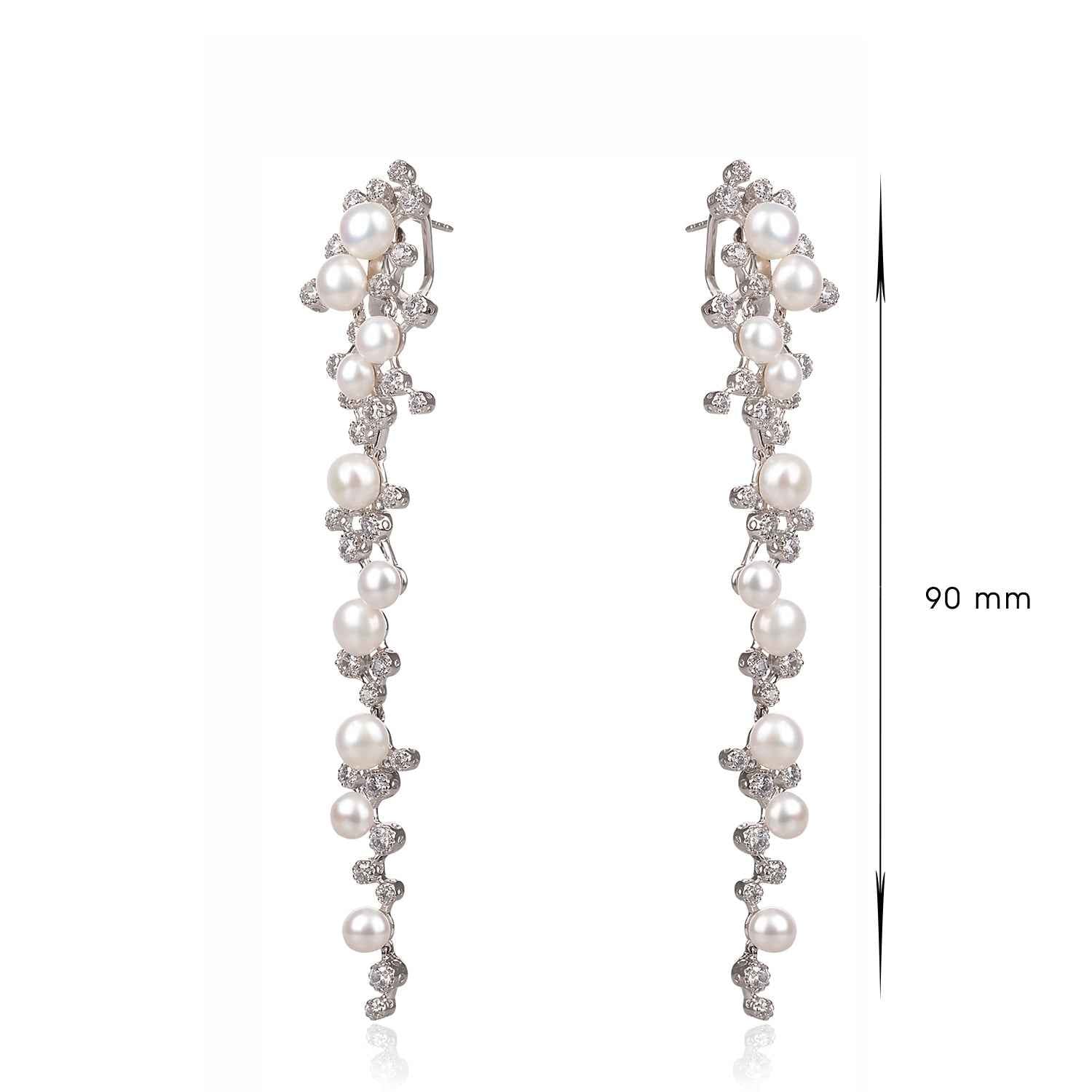 Сребърни обеци с родиево покритие, бели култивирани перли и циркони.