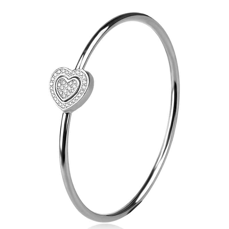 Сребърна твърда гривна с родиево покритие и сърчице закопчалка с инкрустирани цирконии. Едно нежно съблазняващо бижу с послание…