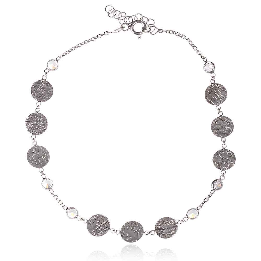 Нежна сребърна гривна за глезен с цирконии и мънички монети. Може да се комбинира с обувка или сандал. Дължината на гривната може да се регулира с удължител.