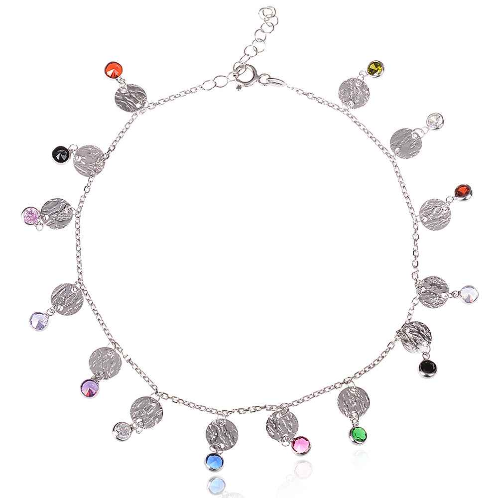 Сребърна гривна за глезен с цветни цирконии. Хит модел с малки монети, които красиво трептят при движение. Може да се комбинира с обувка или сандал. Дължината на гривната може да се коригира с удължител.