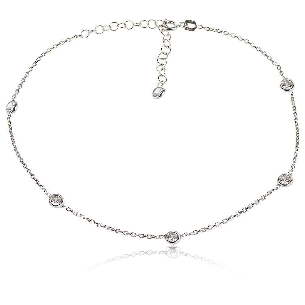 Сребърна гривна за глезен с кръгли циркони в обков. В края на гривната има удължител от халкички, който позволява регулиране на дължината. Бижуто е с родиево покритие, което предпазва среброто от оксидация.