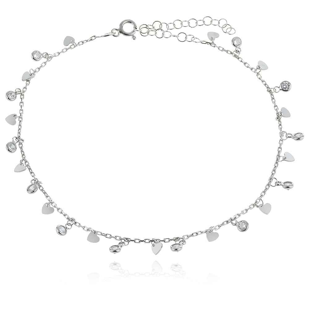 Сребърна гривна за глезен с малки чармчета сърца и цирконий. Гривната е с удължител от халкички за практично регулиране на дължината. Всички халкички са запоени. Бижуто е с родиево покритие, което предпазва среброто от оксидация.