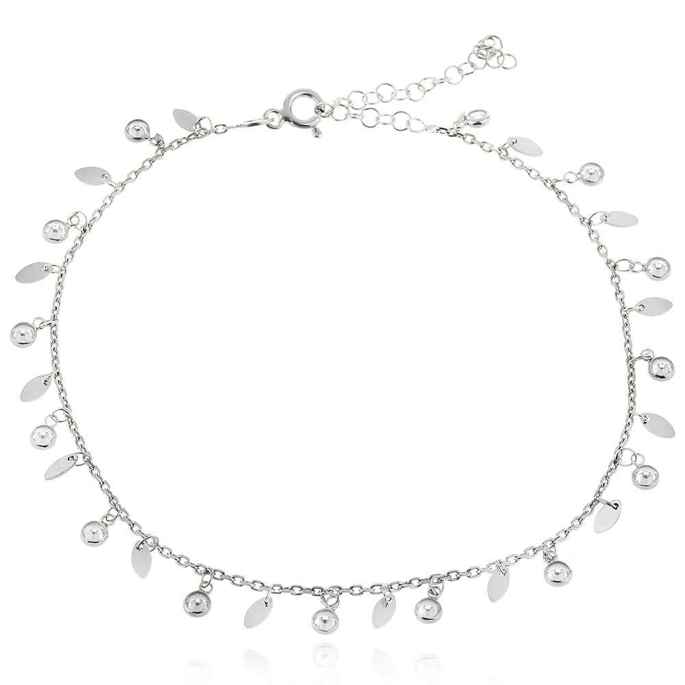 Сребърна гривна за глезен с малки чармчета листенца и цирконий. Гривната е с удължител от халкички за практично регулиране на дължината. Всички халкички са запоени. Бижуто е с родиево покритие, което предпазва среброто от оксидация.