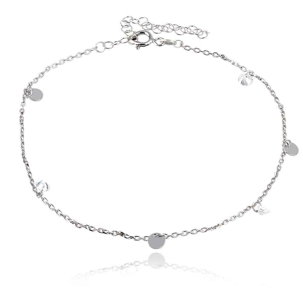 Нежна сребърна гривна за глезен с малки полирани трептящи монетки и кръгли фасетирани циркони. В края на гривната има удължител от халкички, който позволява регулиране на дължината. Бижуто е с родиево покритие, което предпазва среброто от оксидация.