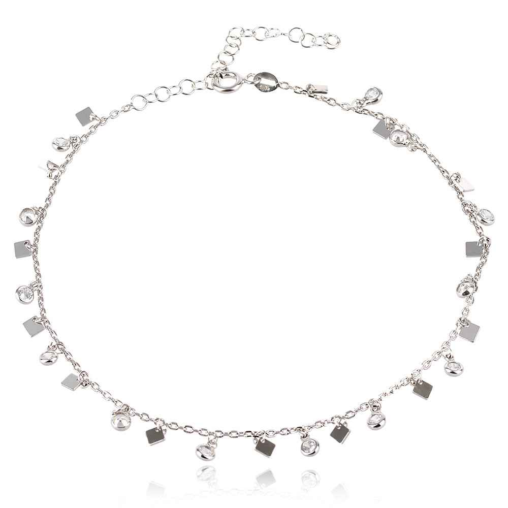 Сребърна гривна за глезен с малки полирани трептящи квадратни плочки и кръгли циркони в обков. В края на гривната има удължител от халкички, който позволява регулиране на дължината. Бижуто е с родиево покритие, което предпазва среброто от оксидация.