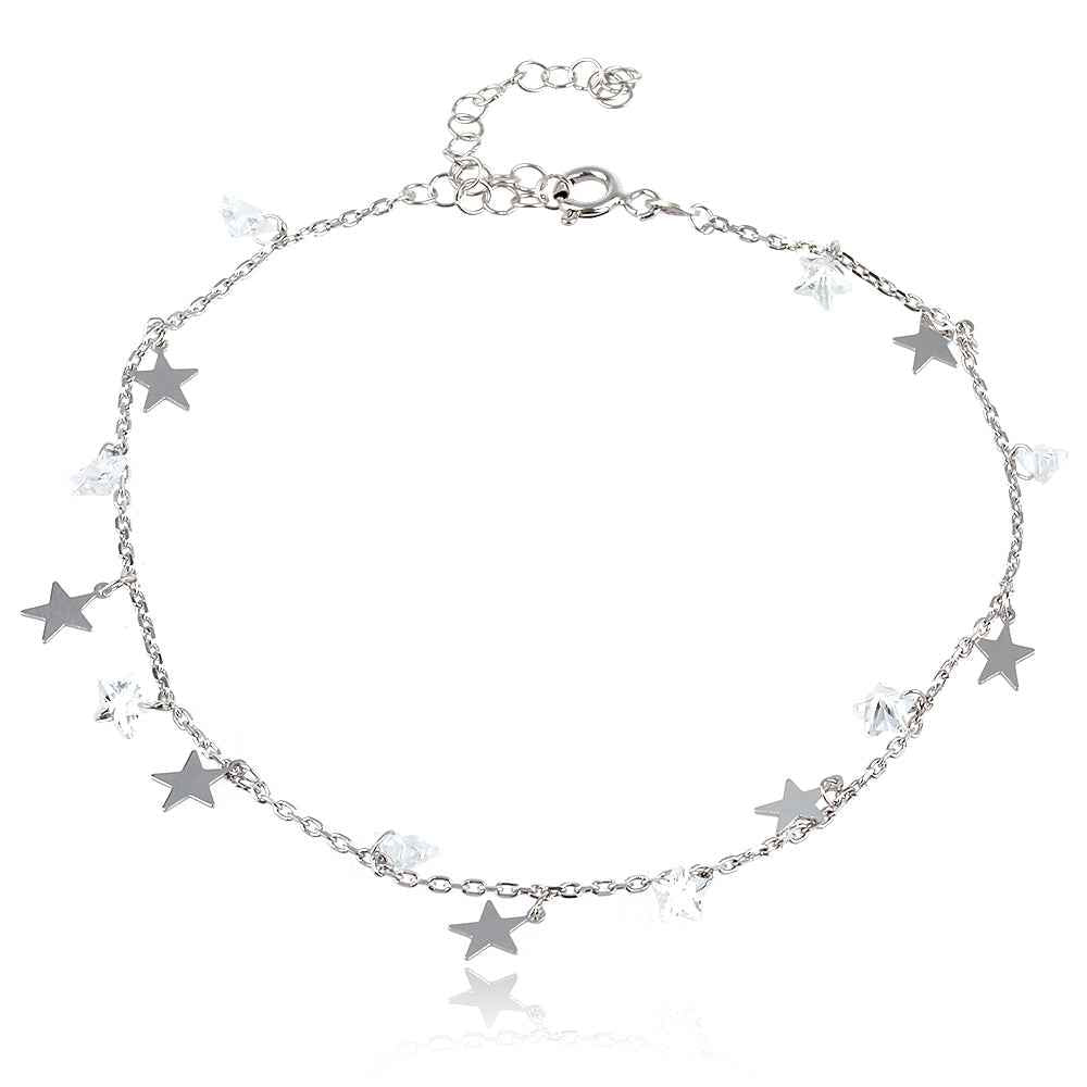 Сребърна гривна за глезен с малки полирани трептящи звездички и циркони фасетирани във форма на звезди. В края на гривната има удължител от халки, който позволява регулиране на дължината. Бижуто е с родиево покритие, което предпазва среброто от оксидация.