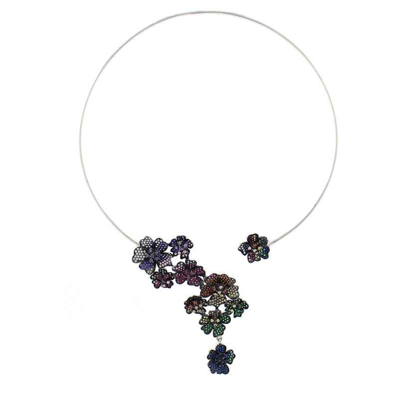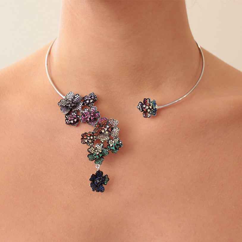 Сребърно колие "Цветя" с цветни циркони и родиево покритие.