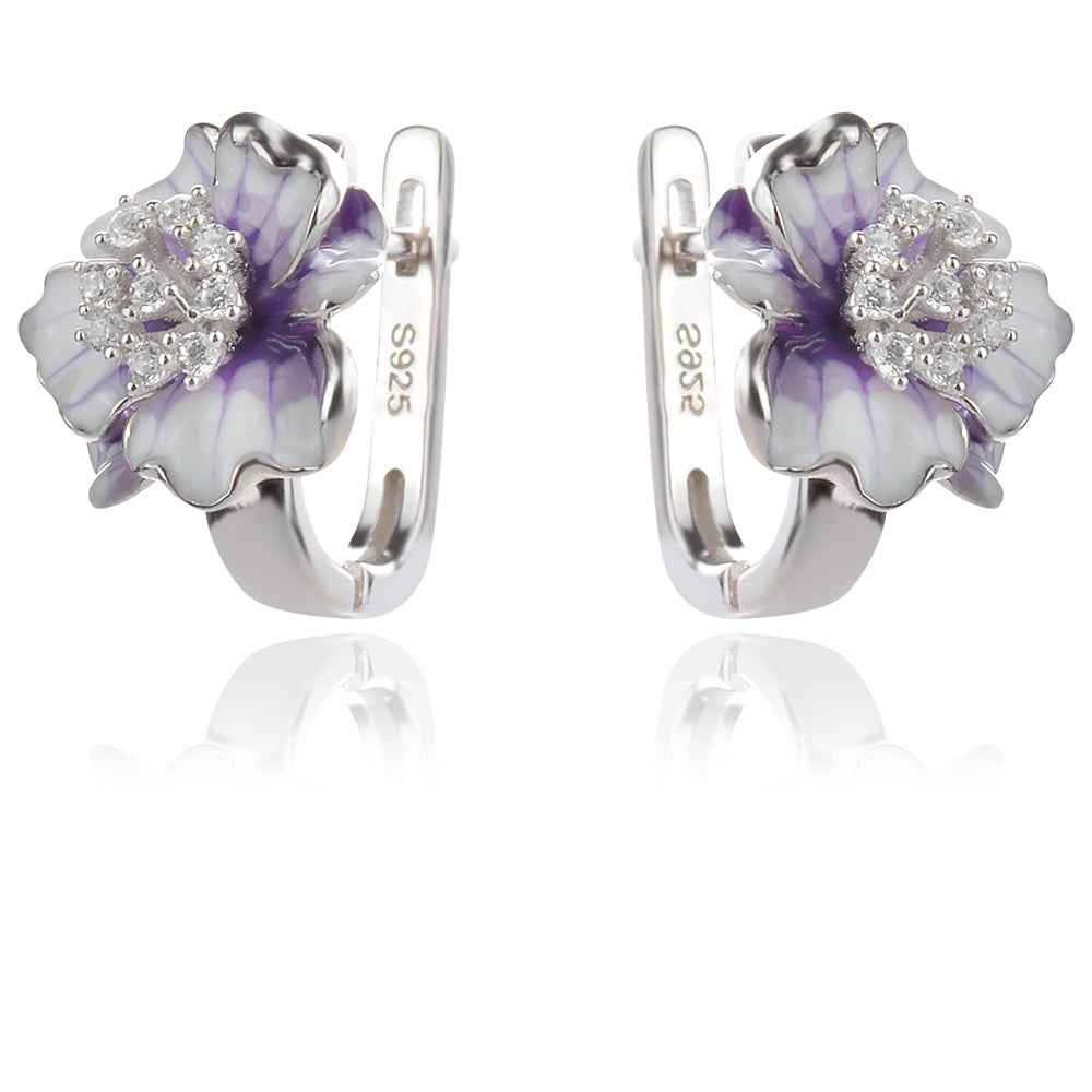 Сребърен комплект от обеци и медальон с красива флорална форма. Цветята са ръчно изрисувани с емайл в бяло и нежно лилаво. Обеците са на удобно английско закопчаване с добре балансиран щифт. Комплектът е с родиево покритие, което предпазва среброто от оксидация и гарантира блясъка на бижуто.