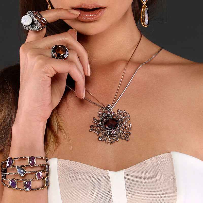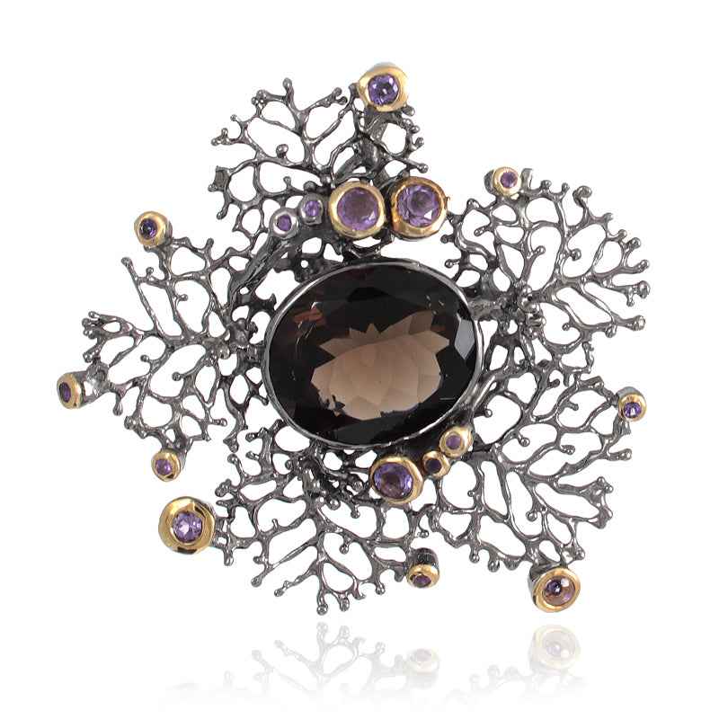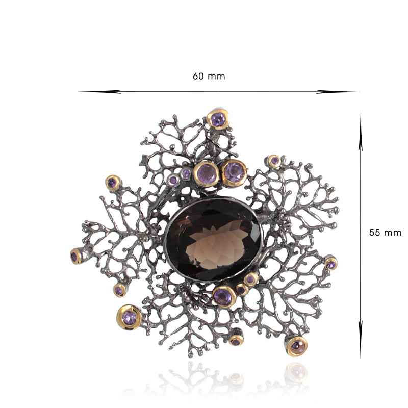 Ръчно изработен сребърен медальон с покритие от рутений и позлата с инкрустация на опушен кварц