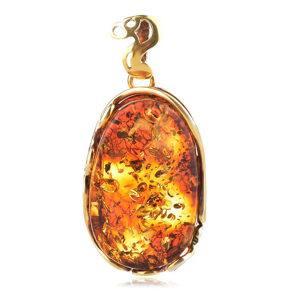 Сребърен медальон с позлата и естествен Балтийски кехлибар с цвят на коняк. Прецизният, ръчно ваян обков с фини орнаменти, подчертава красотата на камъка и превръща бижуто в уникат.
