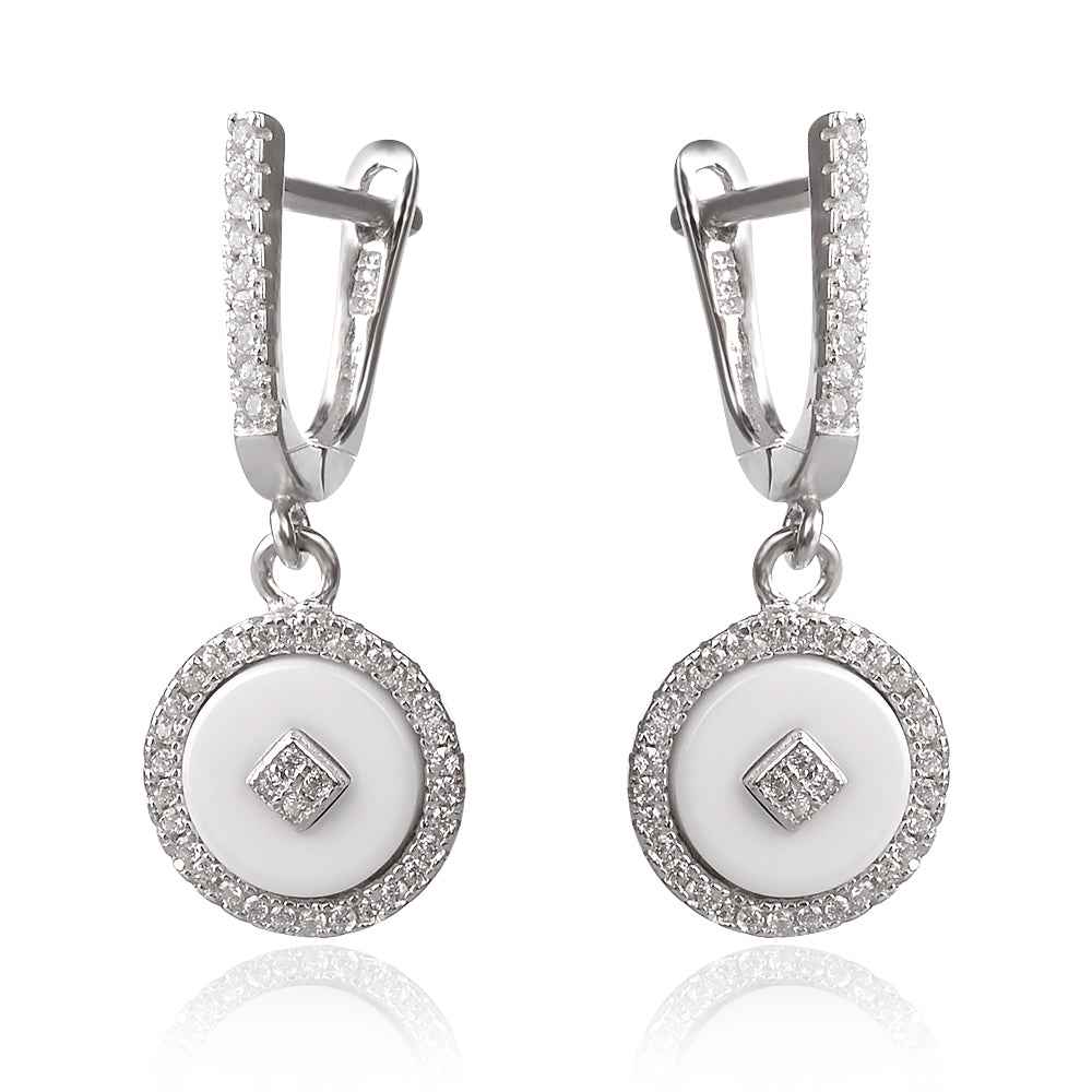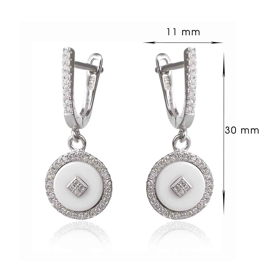 Сребърни обеци с родиево покритие, бяла керамика и цирконии на удобно английско закопчаване.