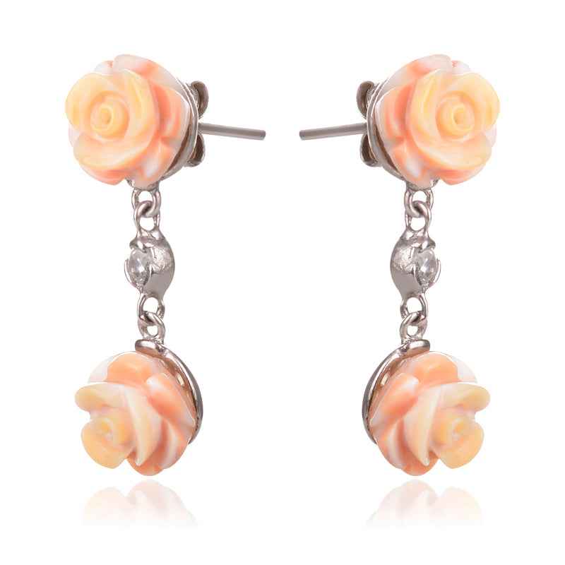 Сребърни обеци с родиево покритие и нежнопрасковен гравиран естествен корал. Тези малки розички внасят истински чар в ежедневна или официална визия, като добре резонират с голяма палитра от цветове.