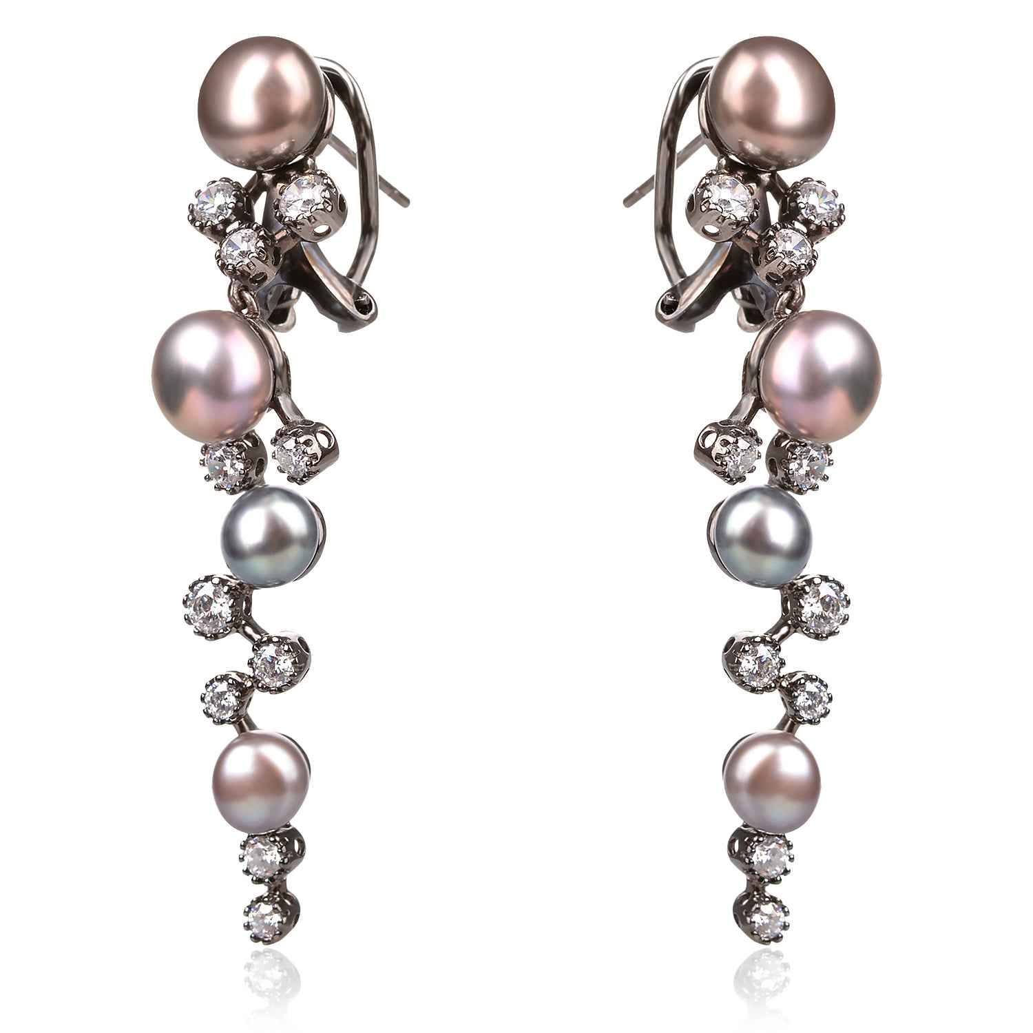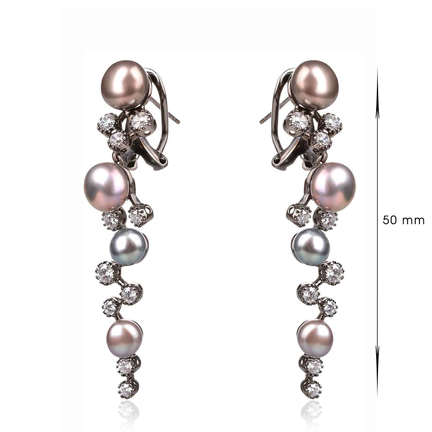 Изящни сребърни обеци с черно родиево покритие, черни перли и цирконии.