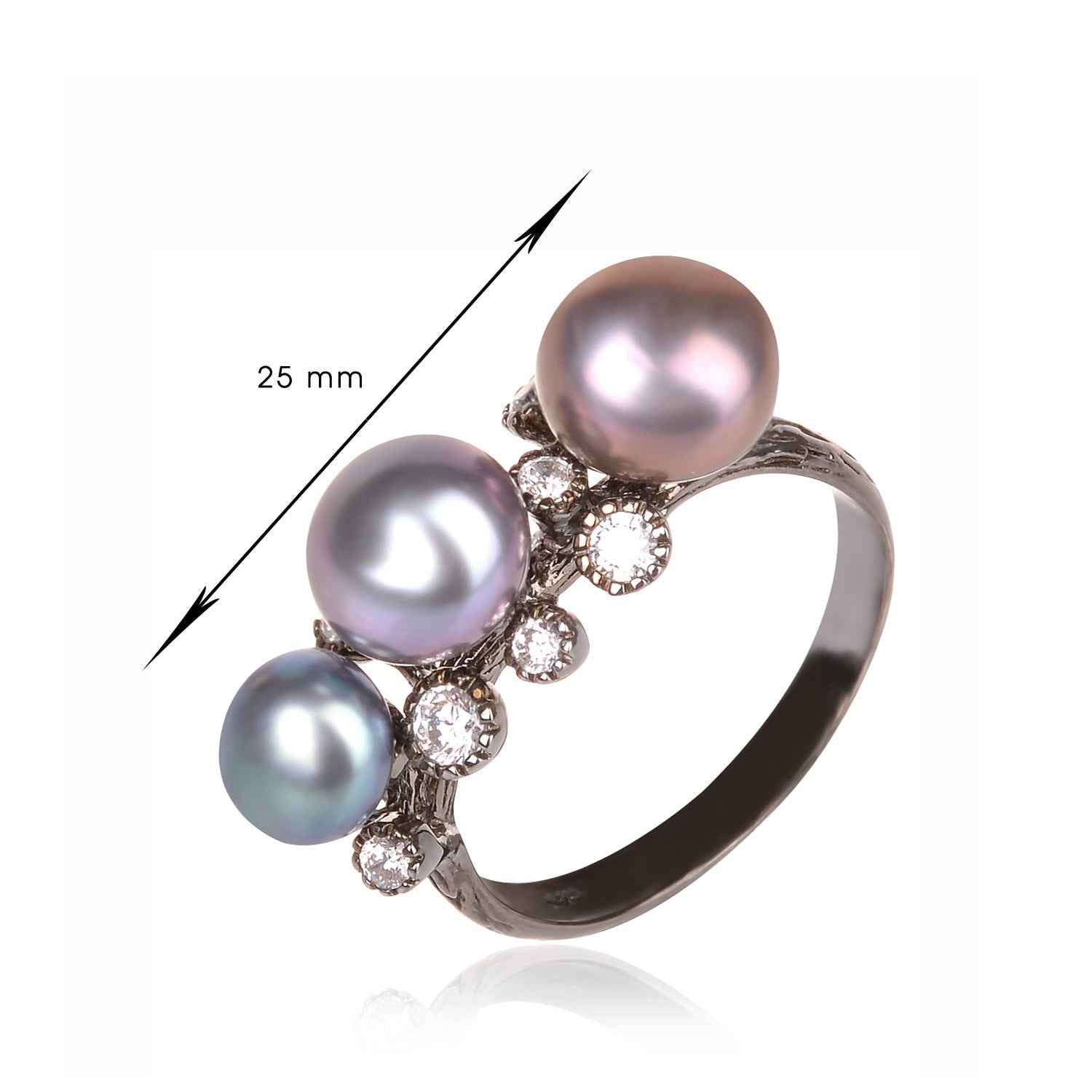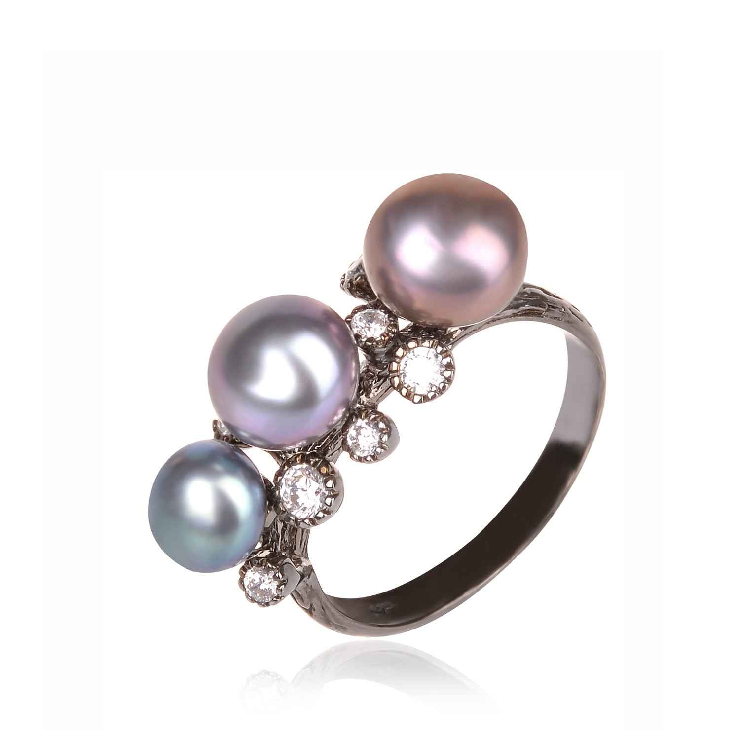 Сребърен пръстен с покритие от черен родий, черни перли и цирконии.