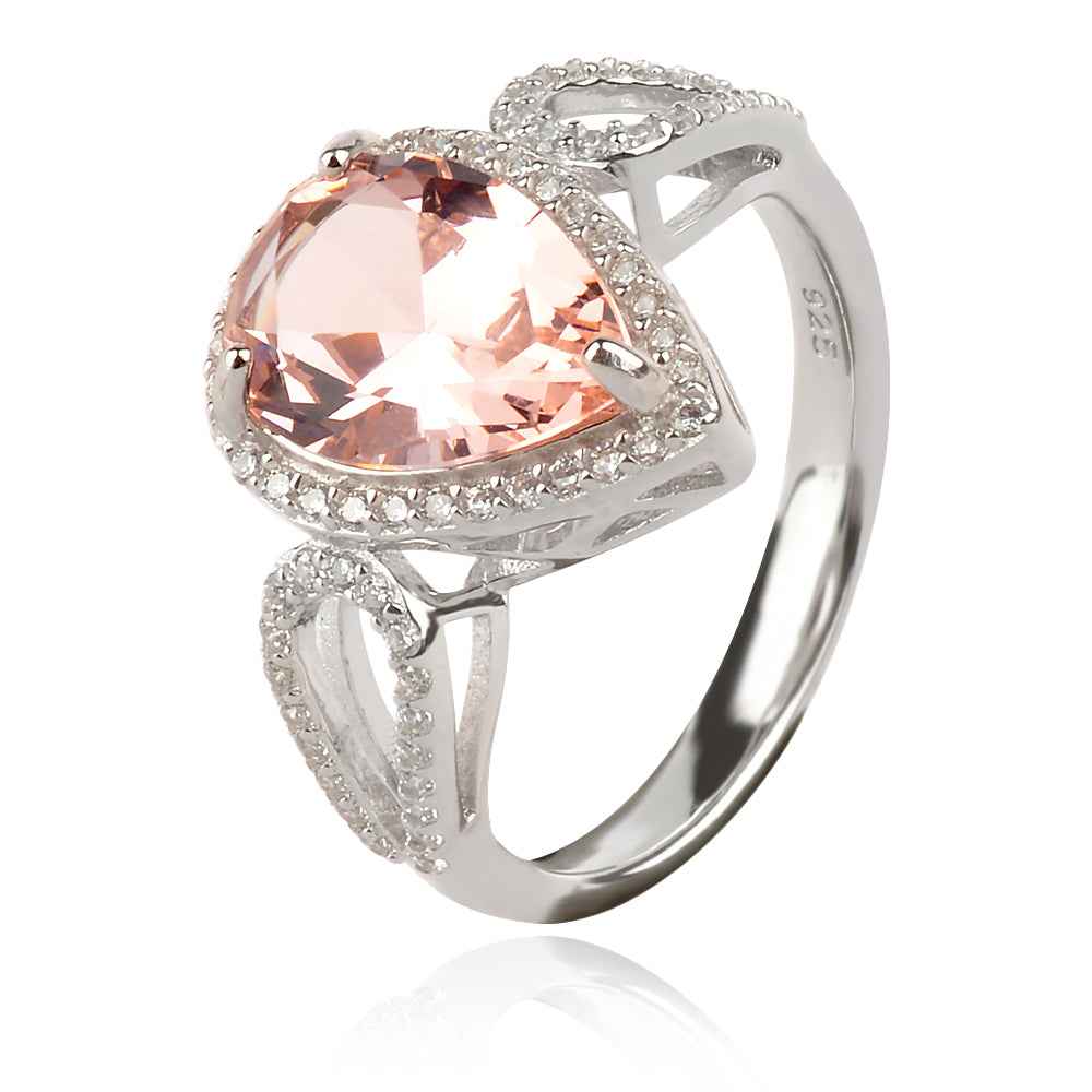 Впечатляващ сребърен пръстен с нежно розов морганит капка в хало обков с циркони.