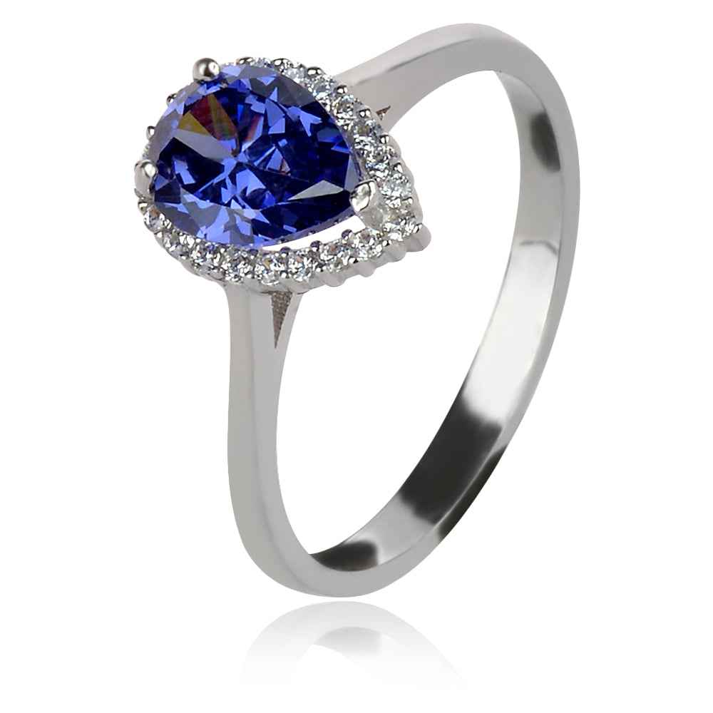 Сребърен пръстен с фасетиран танзанит във формата на малка капка, рамкирана от бели цирконии. Изключителните визуални качества на танзанита го правят желан подарък и любимо бижу за любителките на бижута с цветни камъни.