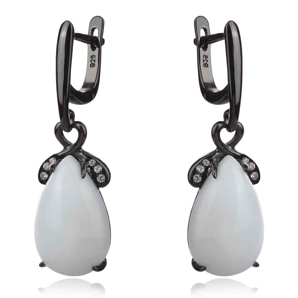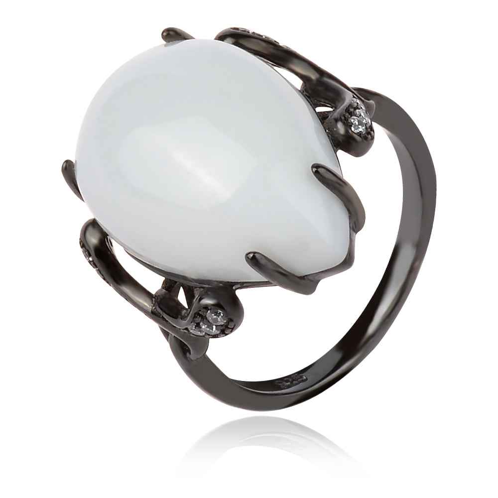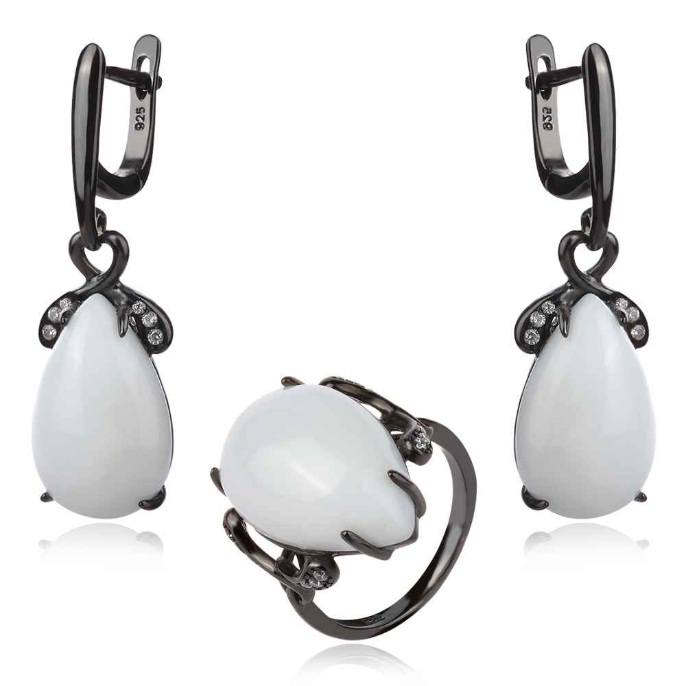 Сребърен комплект с рутений, бял оникс капка и цирконии. Комплектът включва обеци и пръстен. Обеците са на удобно английско закопчаване, а пръстенът е с фиксиран размер (54), който не подлежи на корекция. Това дръзко съчетание от бял оникс и черен рутении ще впечатли всяка дама, която обича смелите комбинации.