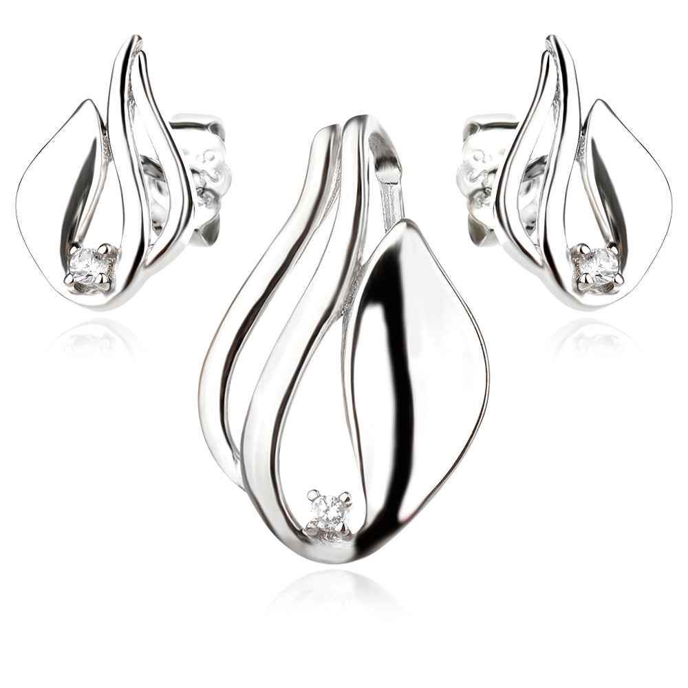 Нежен сребърен комплект от обеци и медальон с красива абстрактна асиметрична форма. Комплектът е с перфектна полировка и прецизно родиево покритие. Обеците се закопчават на щифт.