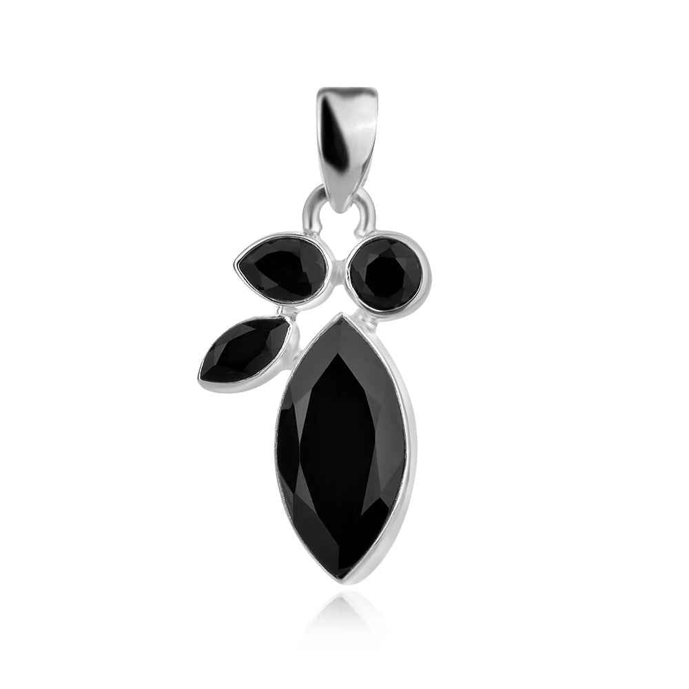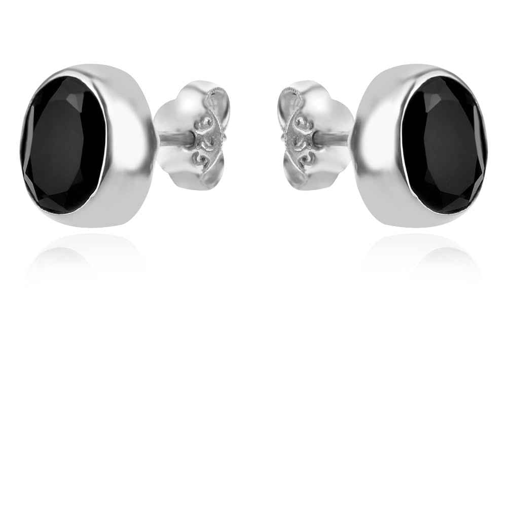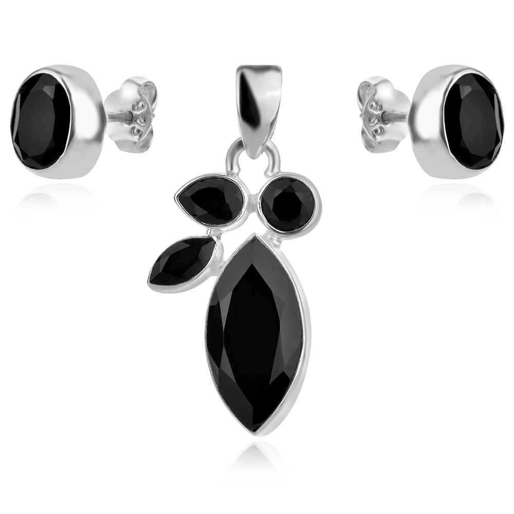Сребърен комплект от обеци и медальон с натурален фасетиран оникс в семпъл обков. Камъните са с естествените си включения и микропукнатини и не са преминали термична обработка за допълнително подсилване на цвета.