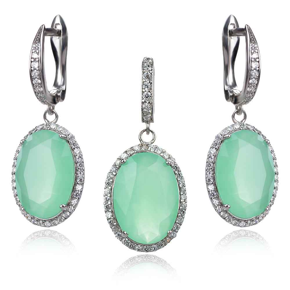 Сребърен комплект с родиево покритие и инкрустация от лабораторен хризопраз и малки бели циркони. Тази деликатна комбинация от цвят и форма би се превърнала в нежен детайл за вечерна или дневна визия. Нежният цвят мента чудесно би се съчетал с облекла в пастелни тонове. Не случайно дизайнерите препоръчват този цвят в случаите, когато искате да създадете усещане за лекота и свежест.