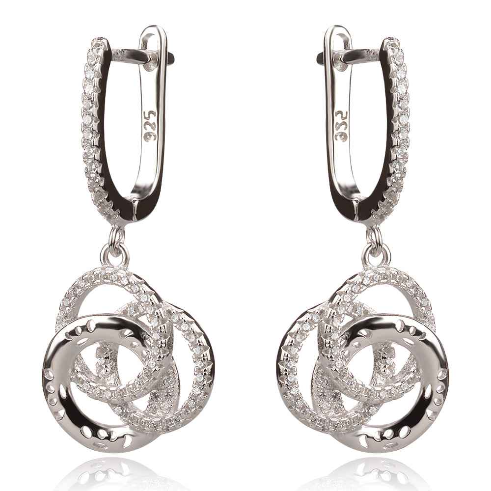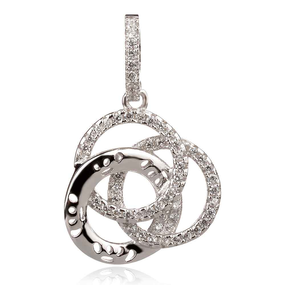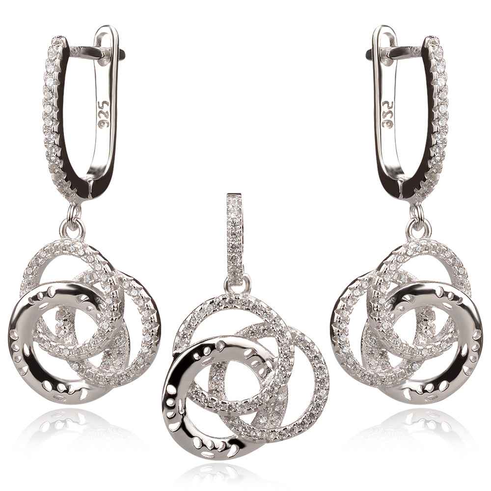 Сребърен комплект от обеци и медальон в абстрактна форма с инкрустирани цирконии. Бижуто е родирано, което гарантира дълготрайния му блясък. Обеците са на английско закопчаване.