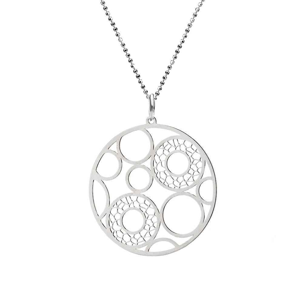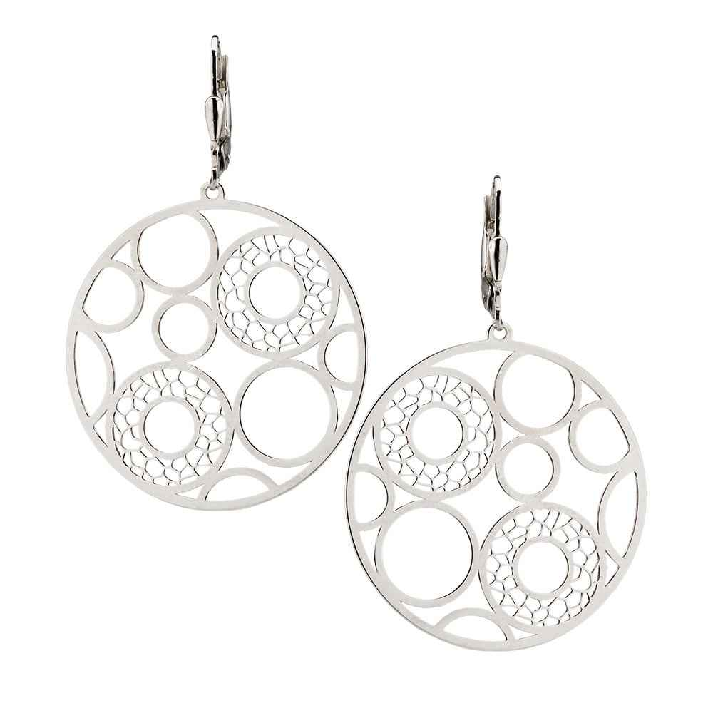 Сребърен комплект от обеци и колие с ефирен италиански дизайн, лазерна обработка и прецизно родиево покритие. Обемен но олекотен модел. Обеците са с удбно закопчаване с лостче (тип руско).