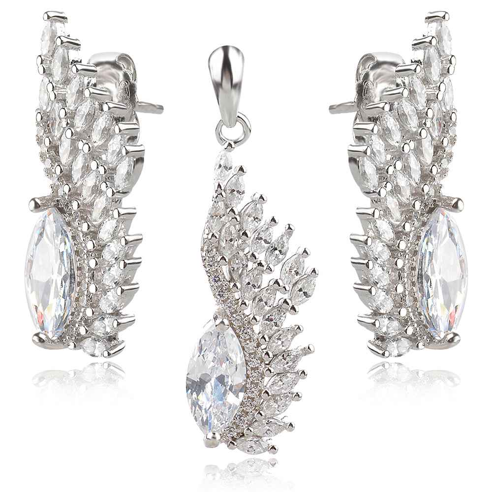 Сребърен комплект обеци и медальон с циркони маркиза. Изящната форма и прецизната инкрустация на камъните превръщат бижуто в перфектен завършек за празнична визия. Родиевото покритие предпазва среброто от оксидация и гарантира блясъка на изделието.