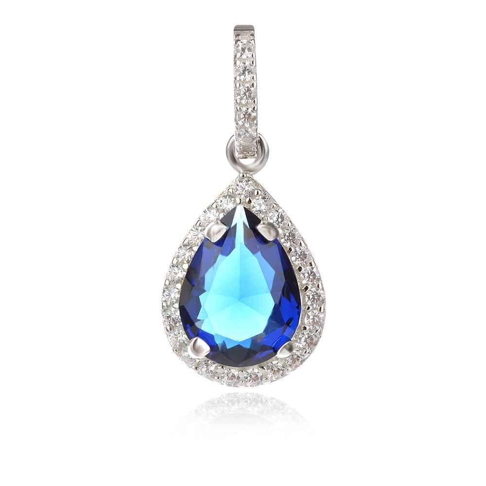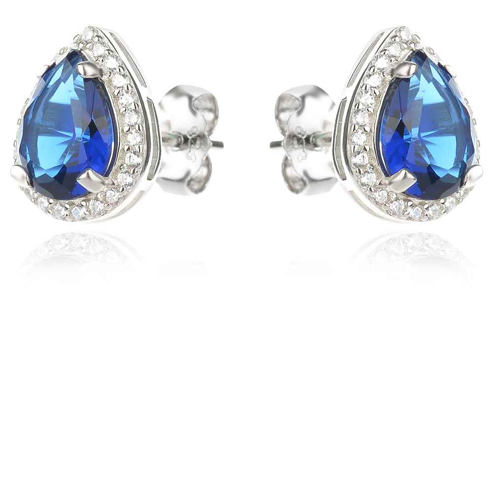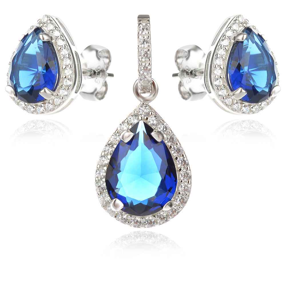Нежен класически комплект от обеци и медальон с красиво шлифован син цирконий капка в хало от бели цирконий. Бижуто е с прецизно родиево покритие, което предпазва среброто от оксидация. Обеците са на щифт. Перфектно цветно допълнение към изискана визия.