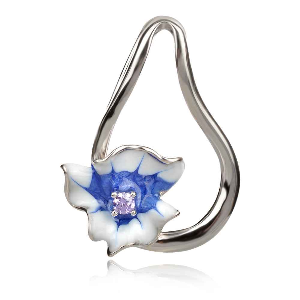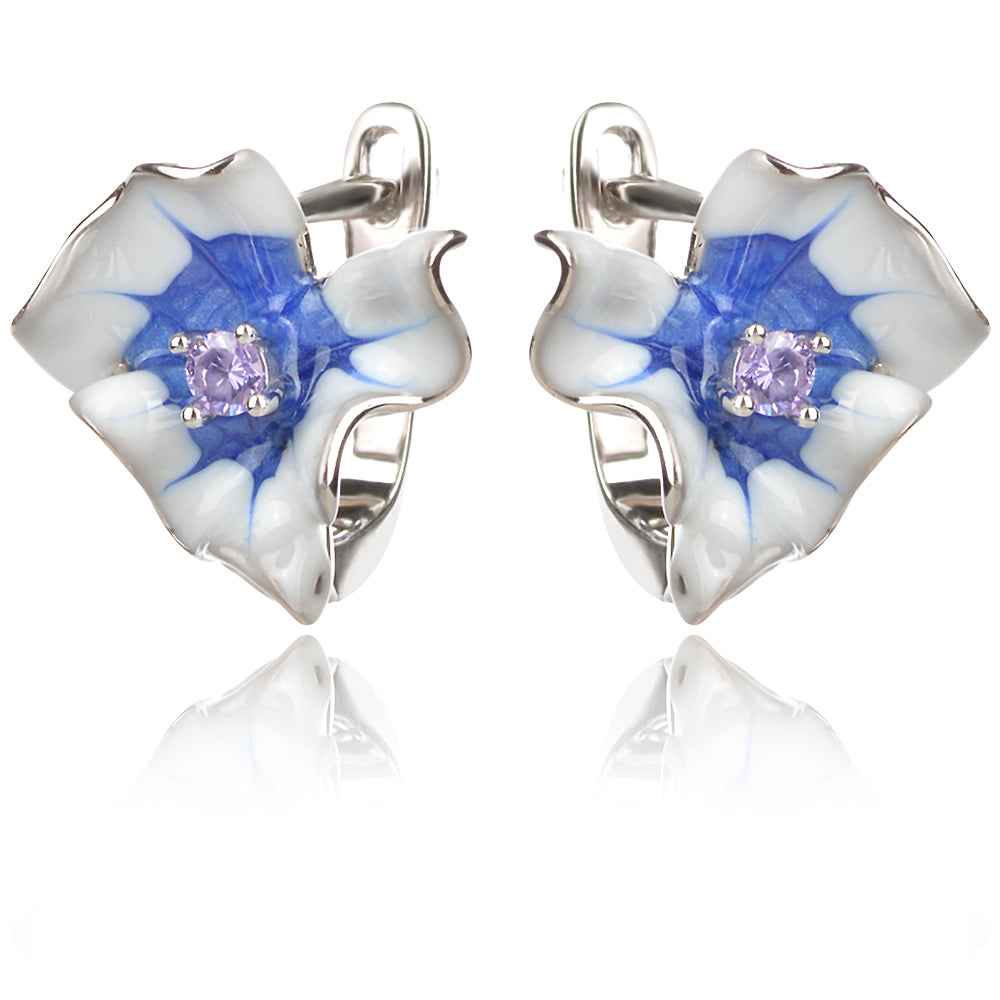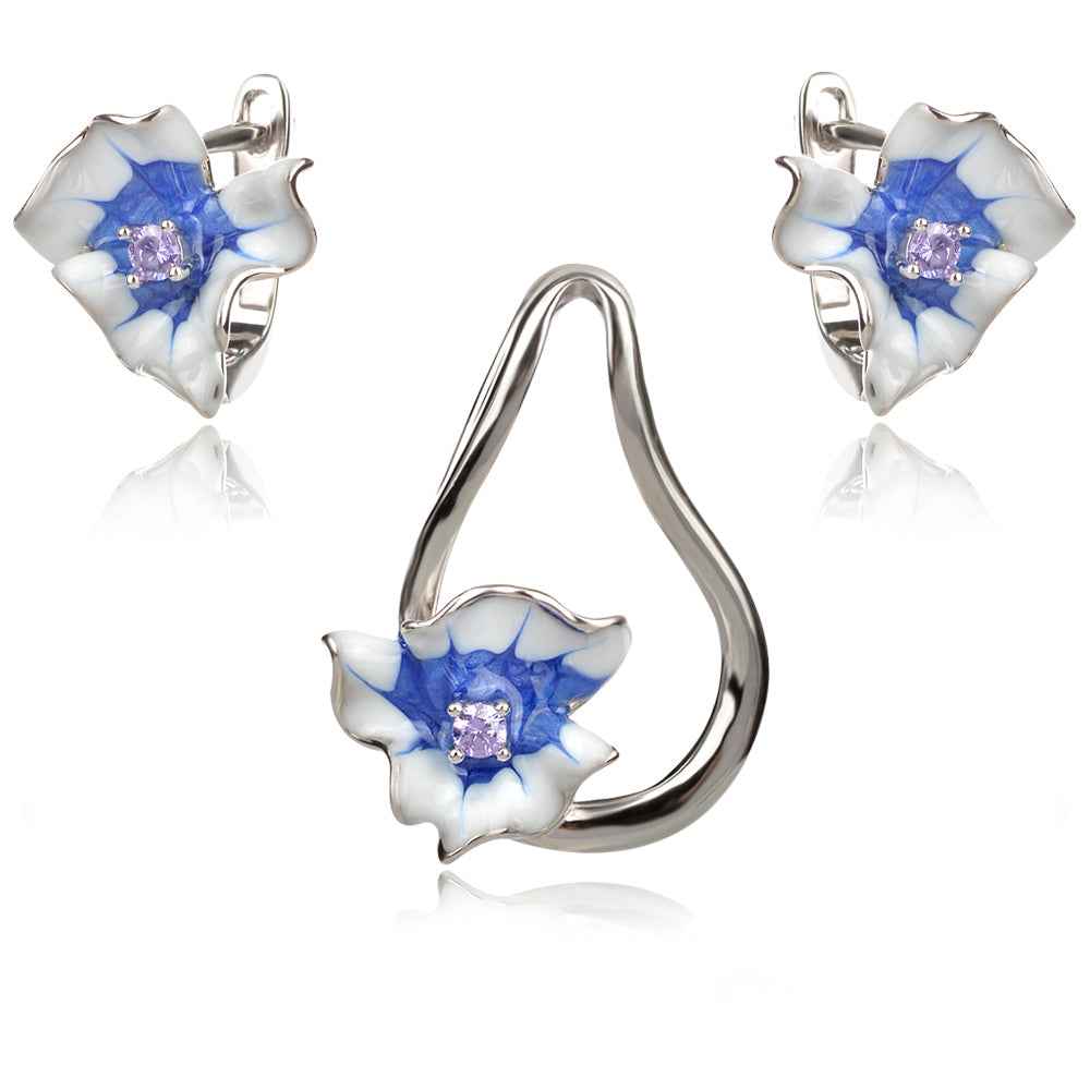 Изящен сребърен комплект от обеци и медальон с красива флорална форма. Цветята са ръчно изрисувани със син и бял емайл. Обеците са на удобно английско закопчаване с добре балансиран щифт. Комплектът е с родиево покритие, което предпазва среброто от оксидация и гарантира блясъка на бижуто.