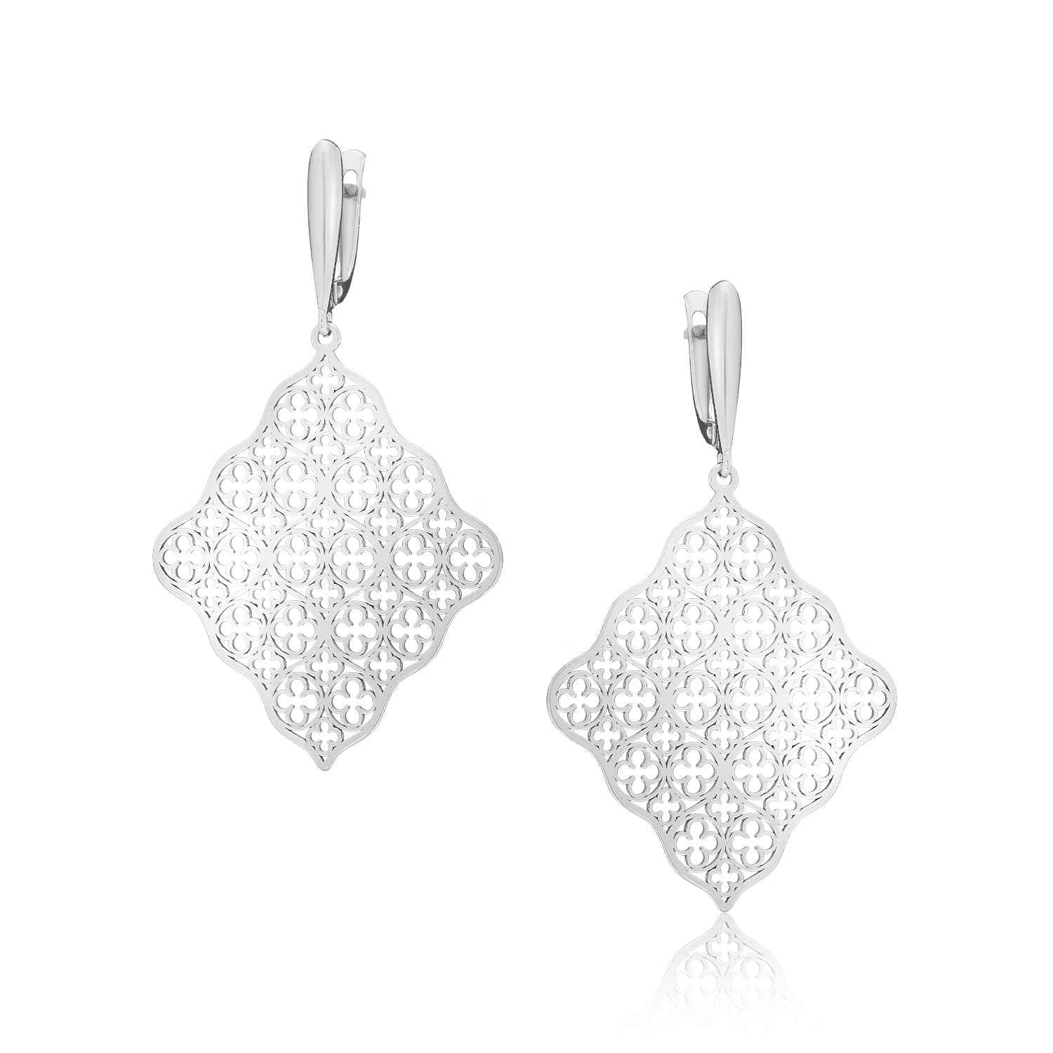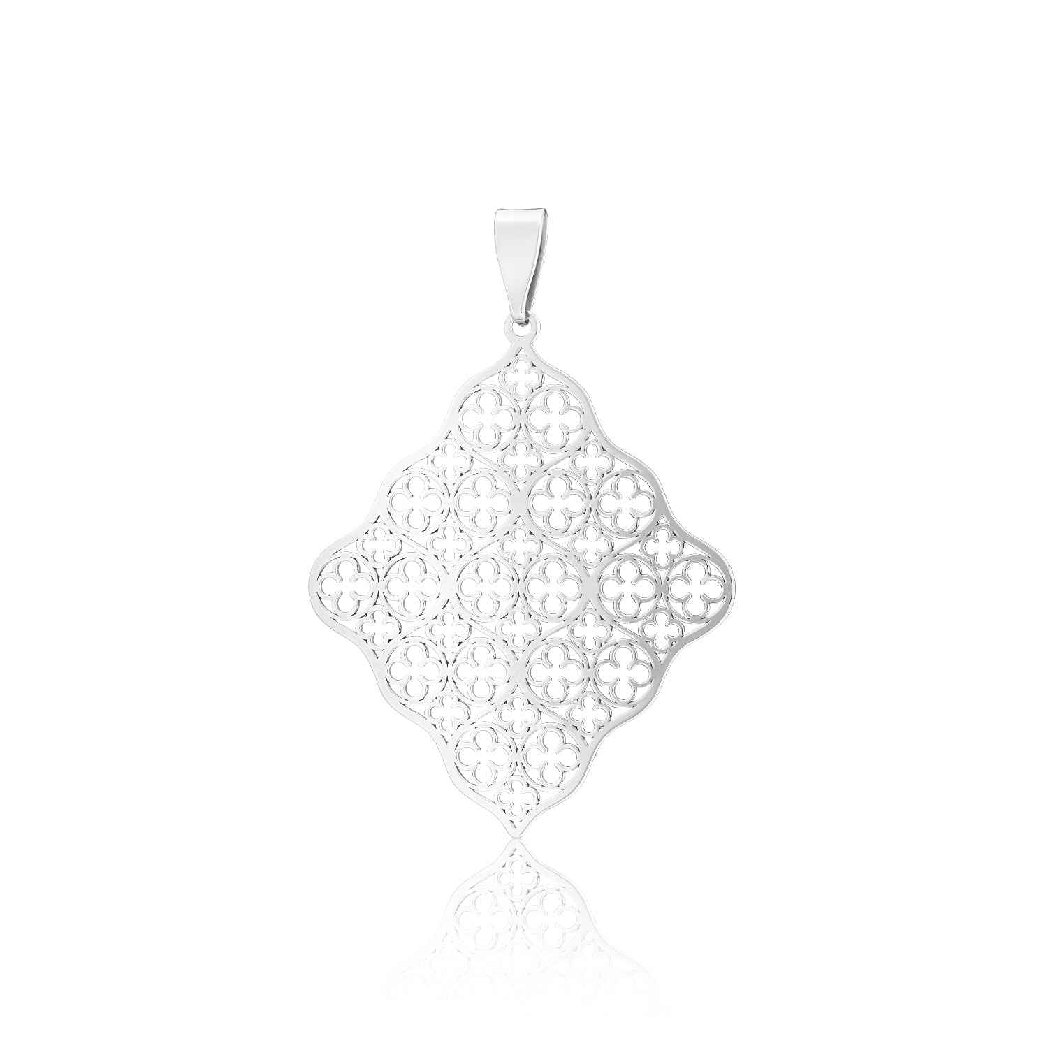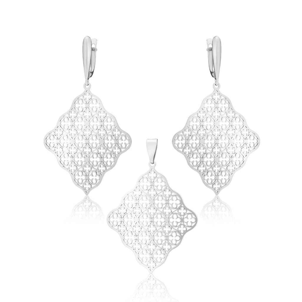 Ефирен ажурен сребърен комплект от обеци и медальон в интересна ромбоидна форма със стилизирани флорални мотиви. Бижуто е с прецизно рориево покритие, което предпазва среброто от оксидация. Обеците са с удобно английско закопчаване.