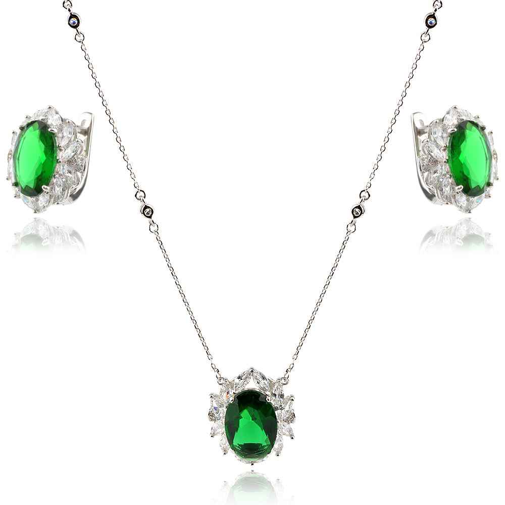 Класически сребърен комплект от обеци и колие с прецизна изработка и красиво фасетирани бели и изумрудено зелени цирконии. Must have за всяка бижутерка! Прекрасен сет за изискан подарък!