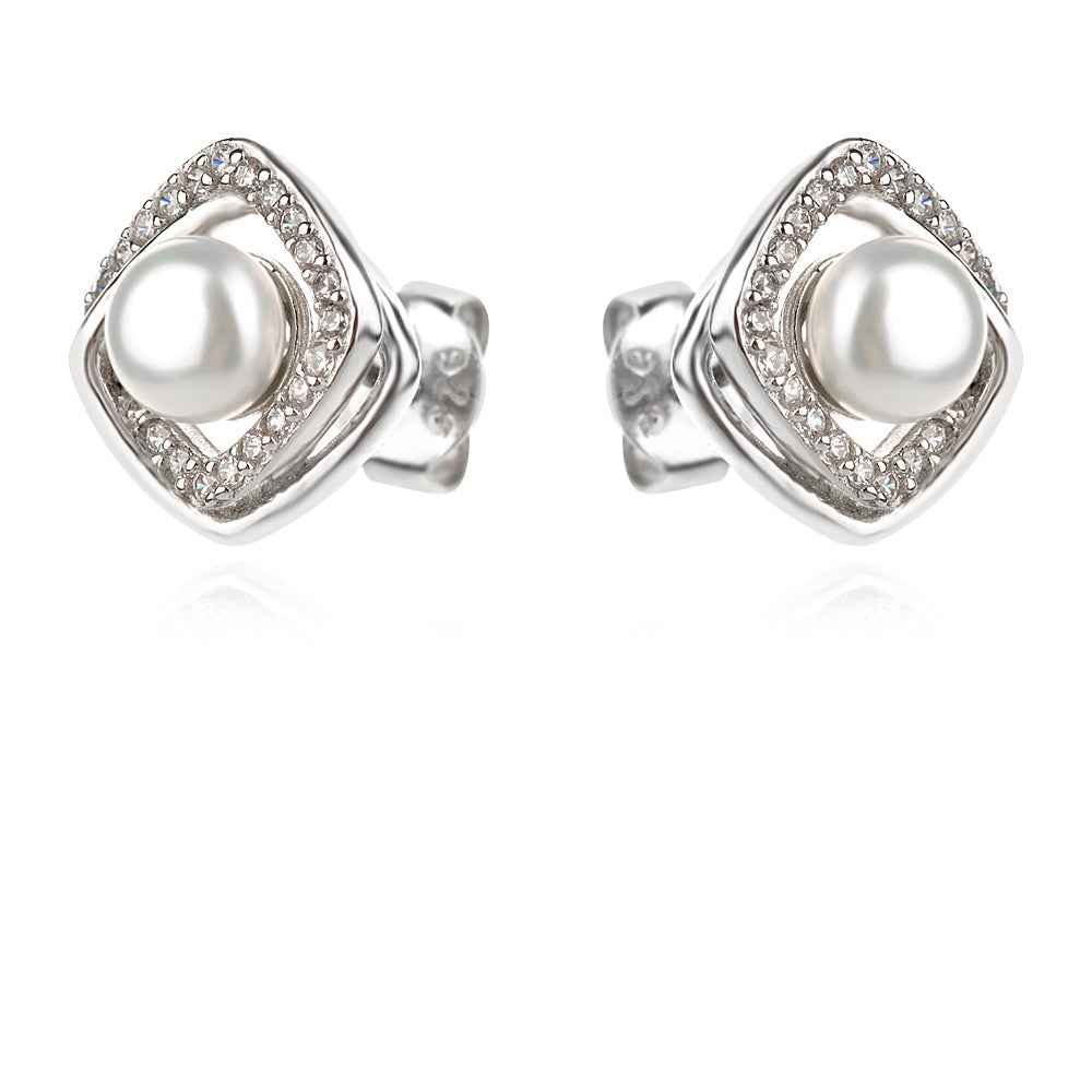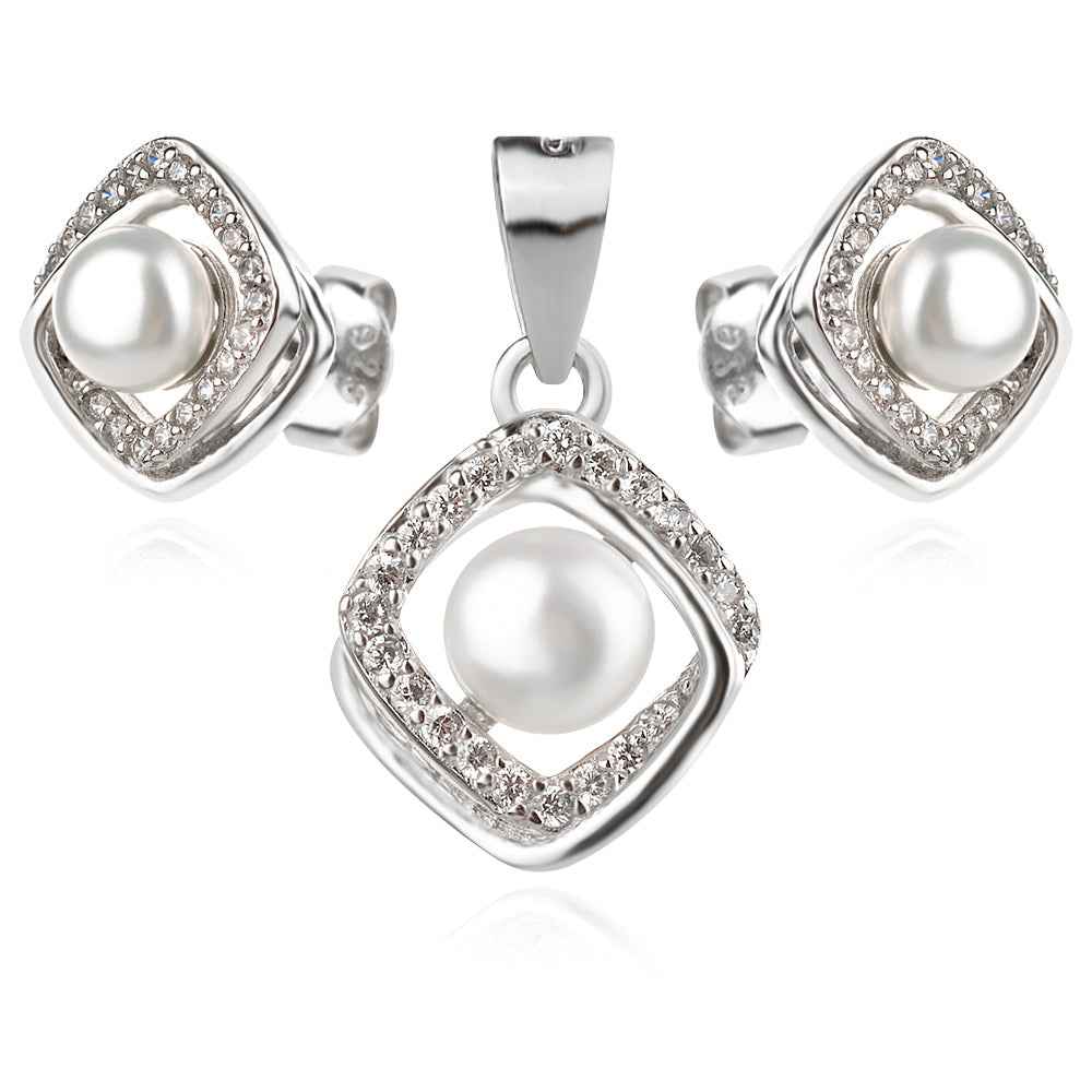 Сребърен комплект от обеци и медальон с бели перли и цирконии- фин щрих, с който да внесете нежност и сияние във визията. Прецизно изработен и с деликатен блясък и размер, сетът е подходящо допълнение за вашите специални моменти. Обеците се закопчават на щифт.