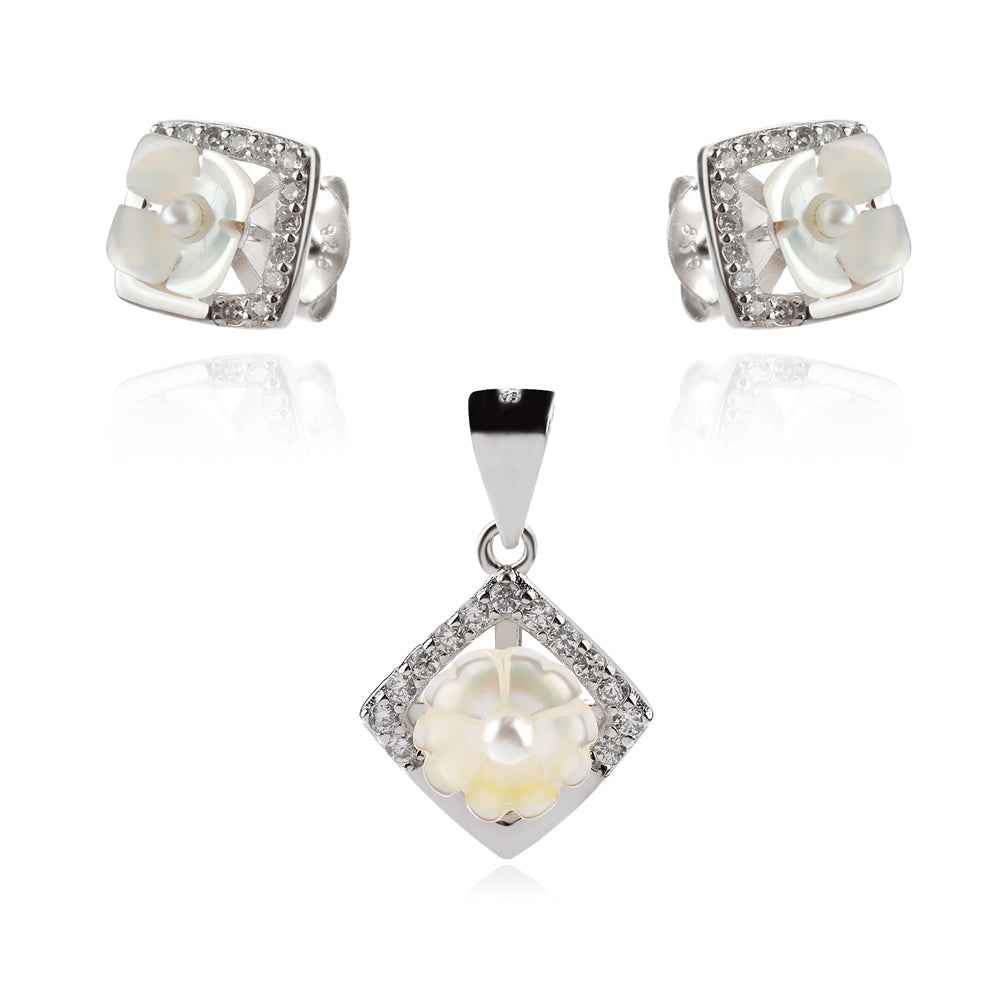 Нежен сребърен комплект във формата на цвете с цвят от седеф и тичинка от микро перла. Една миниатюра, която ще внесе много настроение във визията.